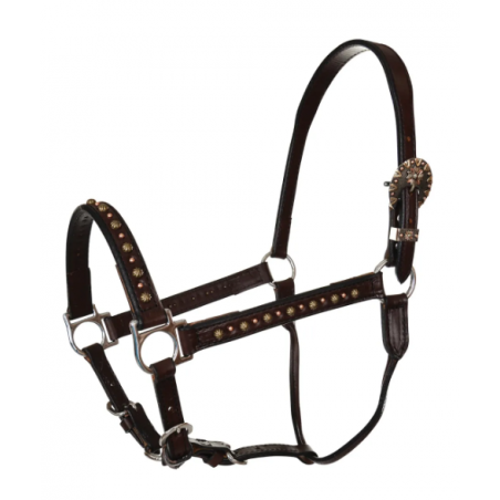 L'alternance de points de cuivre et de laiton confère à ce licol un look classique et épuré. Le cuir chocolat riche se marie parfaitement avec la quincaillerie et les conchos pour un design qui convient à toutes les couleurs de robe. Nous recommandons de nettoyer avec un chiffon humide, les nettoyants peuvent enlever la finition protectrice de la quincaillerie, ce qui peut la ternir. Laisse vendue séparément.